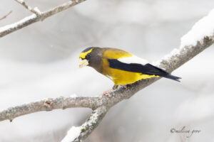 Evening Grosbeak Displaying for Female in Spring, Brooktondale, NY (Grosbeaks)