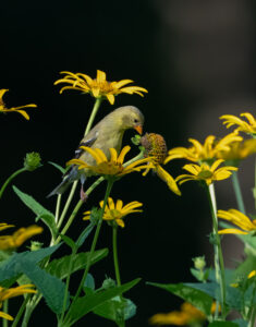 American Goldfinch Harvesting Seed from Sunflower, New York (Goldfinches)